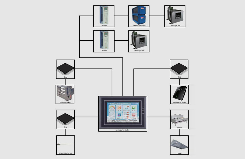 采用芯片管理技术将烹饪设备上的传感器数据进行收集,并且通过算法计算出实际需求风量,同时通知变频器与可调风量阀,使之按照实际需求供给排风量。并且同步调整空调新风供给,让厨房保持在微负压的平衡状态。